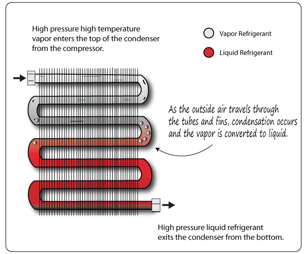 冷凝器是一個(gè)用于將制冷劉所含熱量釋放、并將制冷劑由氣態(tài)轉(zhuǎn)變成液態(tài)的熱交換器。將高溫高壓的氣態(tài)制冷劑變成高壓液態(tài)制劑。